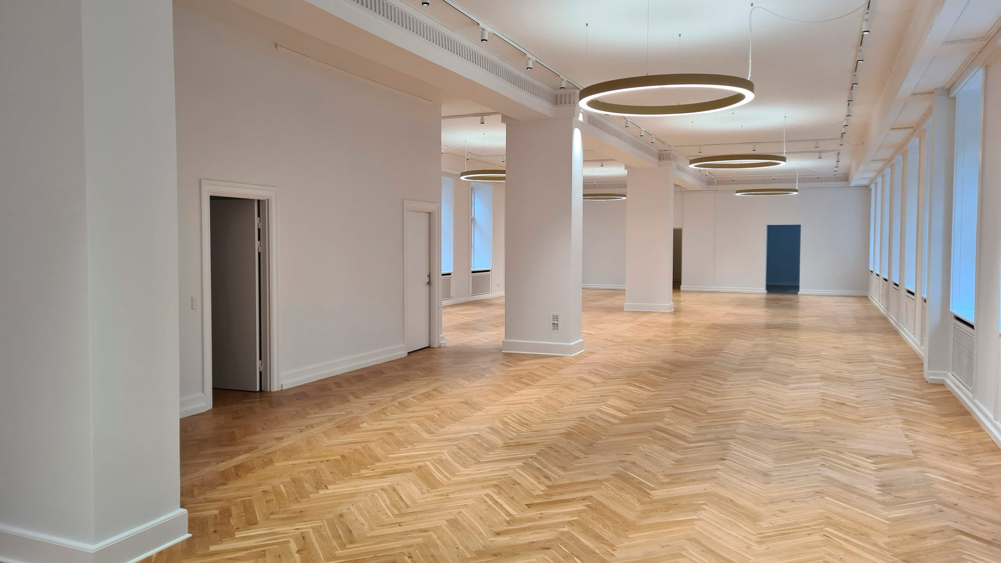 - Bevaring og renovering af de originale sildebenparketgulve, som nu fremstår fuldt restaurerede.