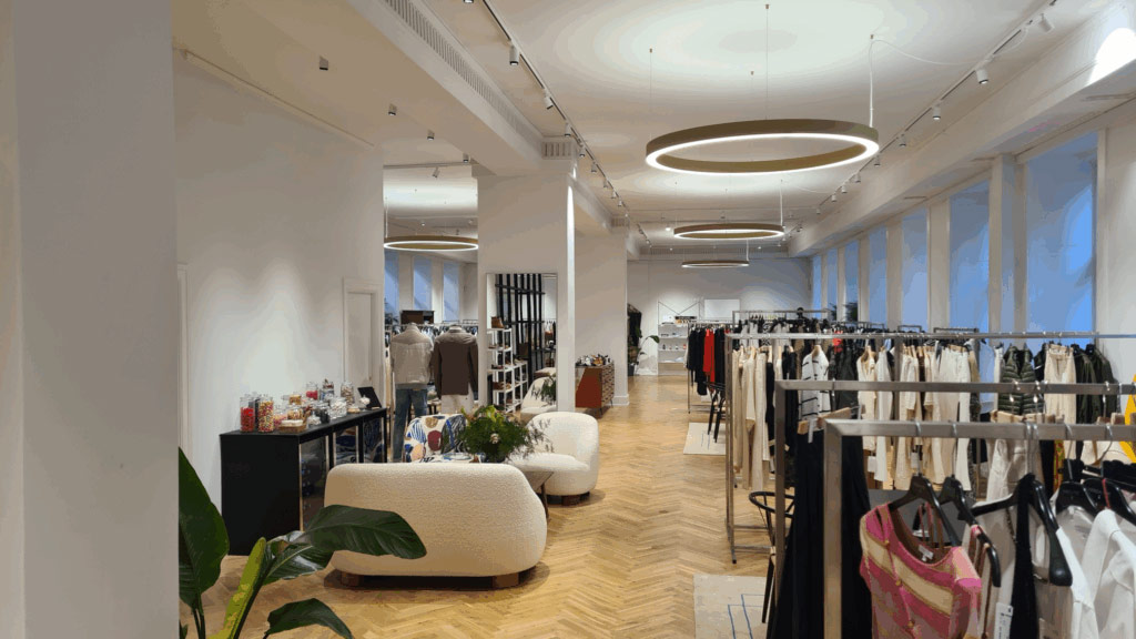 På Hammerensgade 4 i stuen, København K, har vi med stor præcision og på kort tid projekteret og stået for byggeledelsen i forbindelse med en omfattende istandsættelse af 612 m² eksisterende storrumskontor. Projektet har forvandlet et gammelt kontormiljø, præget af tæppebelægning og nedhængte lofter, til en stilfuld og moderne flagshipstore for modebranchen. Den tekniske hovedindsats omfattede: